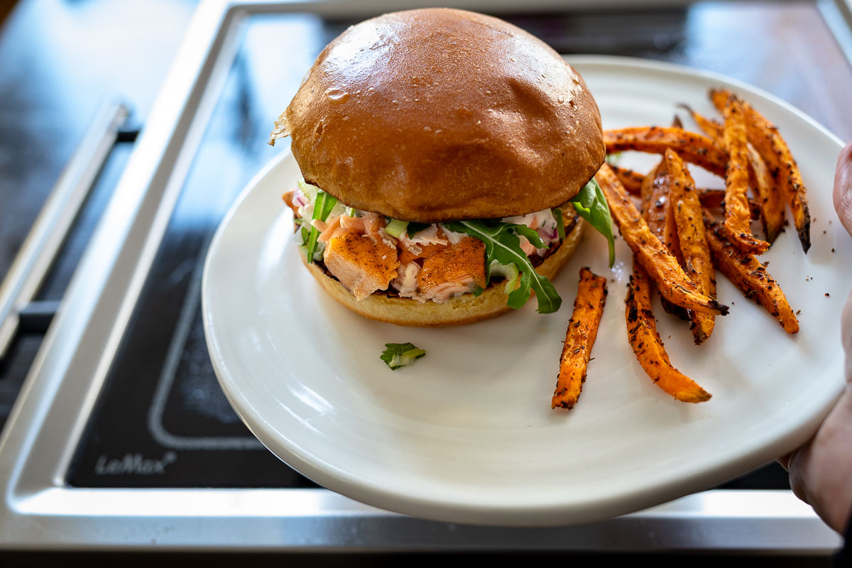 Denn Lachs ist voll mit gesunden Omega 3 Fettsäuren und ist damit auf jeden Fall eine gesunde Alternative zum klassischen Burger-Fleisch. Und das Beste daran ist die einfache Zubereitung. Ihr bekommt ein sehr lockeres Lachsfleisch, dass Euch auf einem Burger positiv überraschen wird. Der Pulled Lachs Burger ist also gesünder, schneller zubereitet und schmeckt unglaublich lecker.