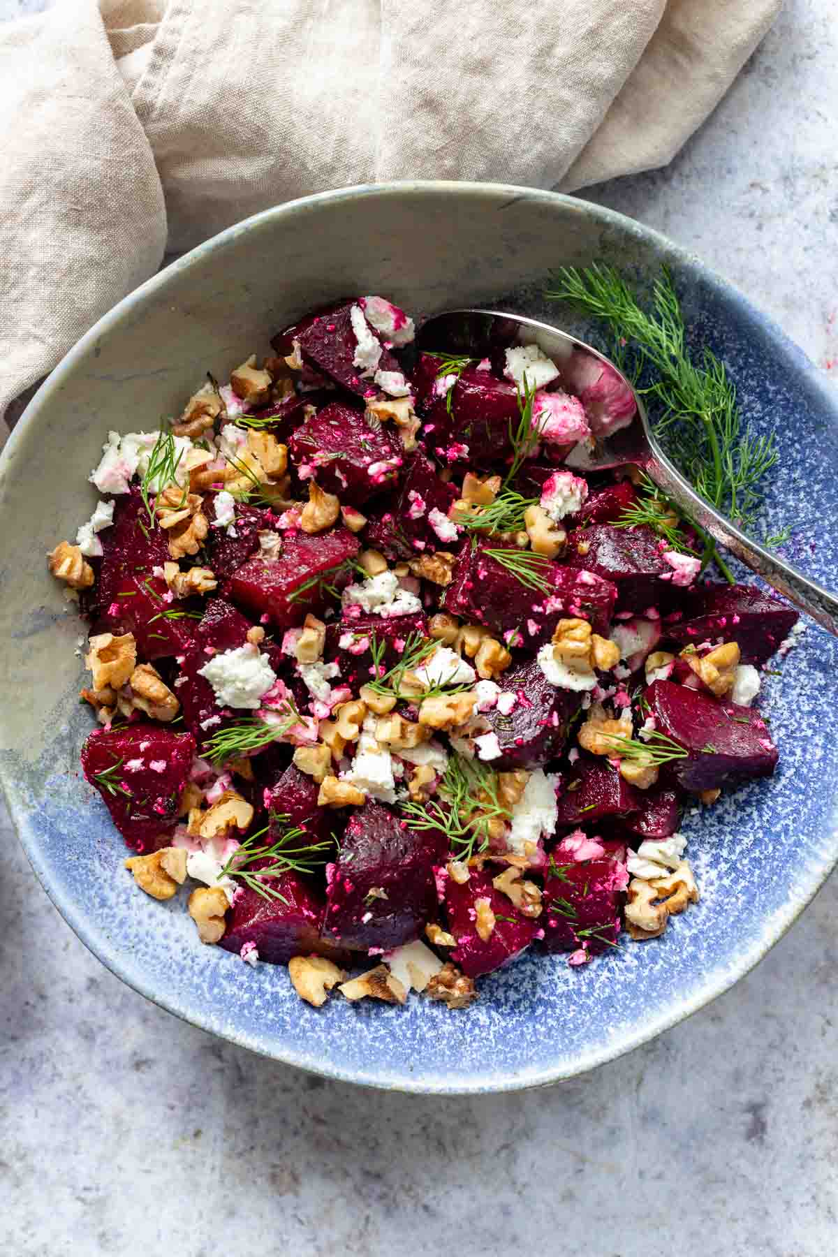 Ein Rezept für einen einfachen Rote Bete Salat mit Feta, Walnüssen und Dill. Dieser Salat hat die perfekte Balance aus erdig süßen, herzhaften und salzigen Aromen. Und natürlich ist er super gesund und einfach zu variieren. Ihr könnt ihn im Voraus zubereiten und bis zu drei Tagen im Kühlschrank aufbewahren. Fehlt Euch noch was? Klar, er ist super lecker!