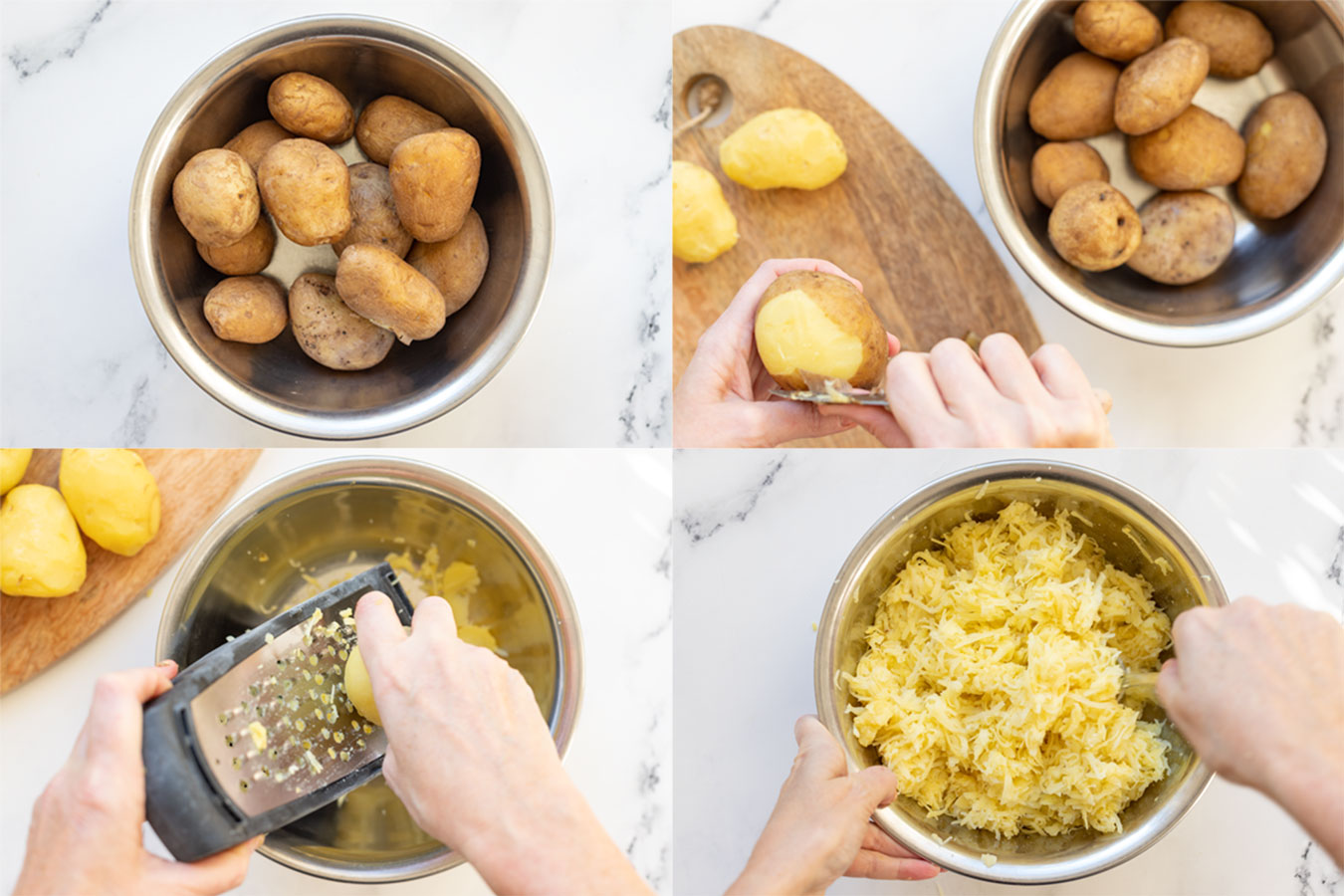 Am besten kocht Ihr die Kartoffeln am Tag vorher, damit sie vor dem Reiben vollständig abgekühlt sind. Sobald sie nach dem Kochen abgekühlt sind, solltet Ihr sie über Nacht im Kühlschrank aufbewahren. Alternativ könnt Ihr sie auch am Morgen in den Kühlschrank stellen. Das reicht zur Not auch noch aus, damit sie richtig kalt sind. Das ist wichtig, damit Ihr sie reiben könnt und kein Püree daraus wird, da sich die Struktur der Stärke verändert. Wenn Kartoffeln kalt werden, entwickeln sie eine resistente Stärke, die auch präbiotisch ist.